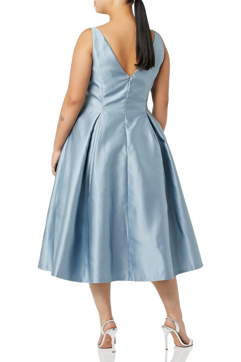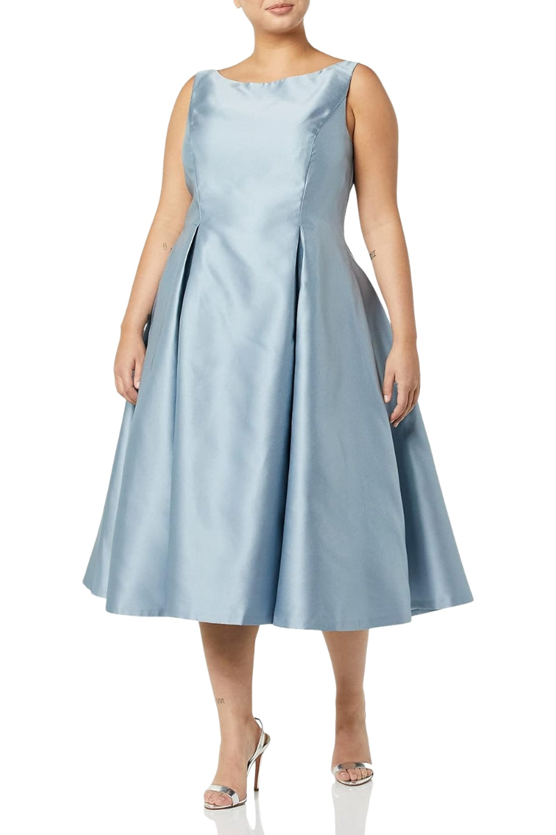 Adrianna Papell Bateau Neck V-Cut Back Neckline Sleeveless Fit-and-Flare Bodice Pleated A-Line Skirt Midi Dress
