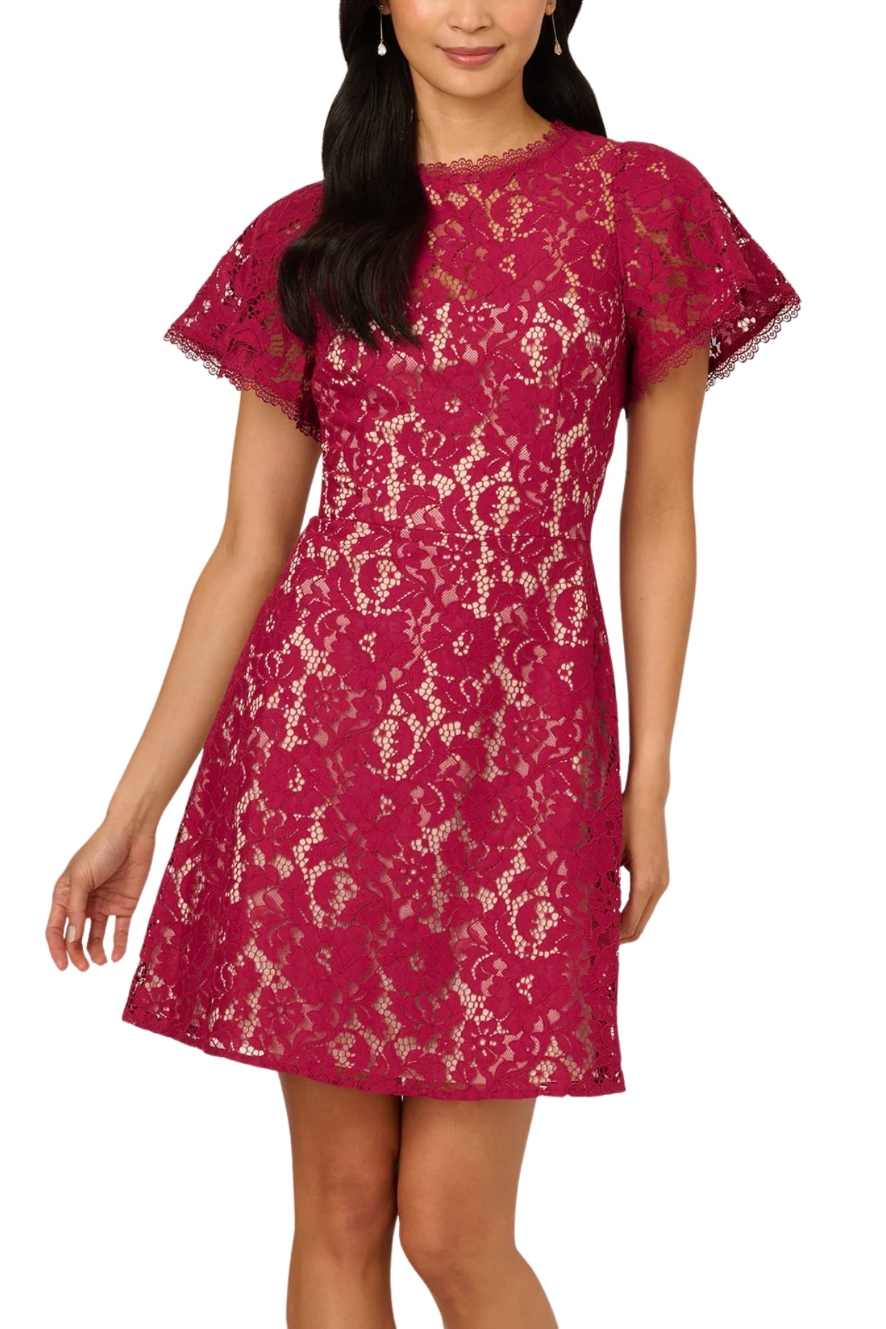 Adrianna Papell Illusion Neckline Wide Short Sleeves Define Fit Bodice Lace Overlay A-Line Short Dress