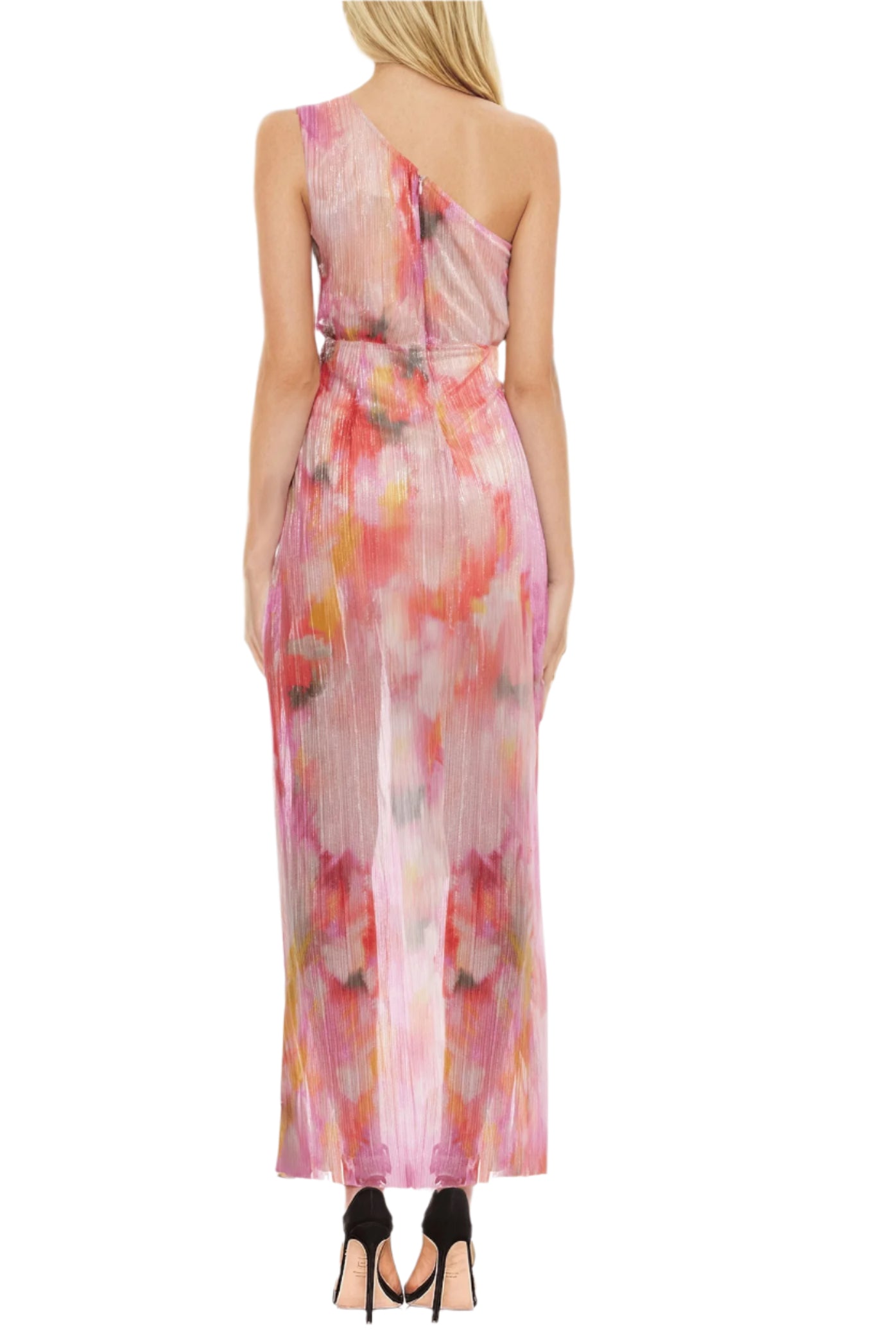 Crafted from luminous metallic mesh (100% Polyester), this one-shoulder silhouette catches the light with every step, adding a soft shimmer that transitions beautifully from day into evening. The expertly draped side waist fold enhances your natural shape, while the sheer skirt overlay brings ethereal movement and elegance. A side zipper ensures a smooth, contoured fit, and the fully lined interior (100% Polyester) offers coverage and comfort from ceremony to celebration.