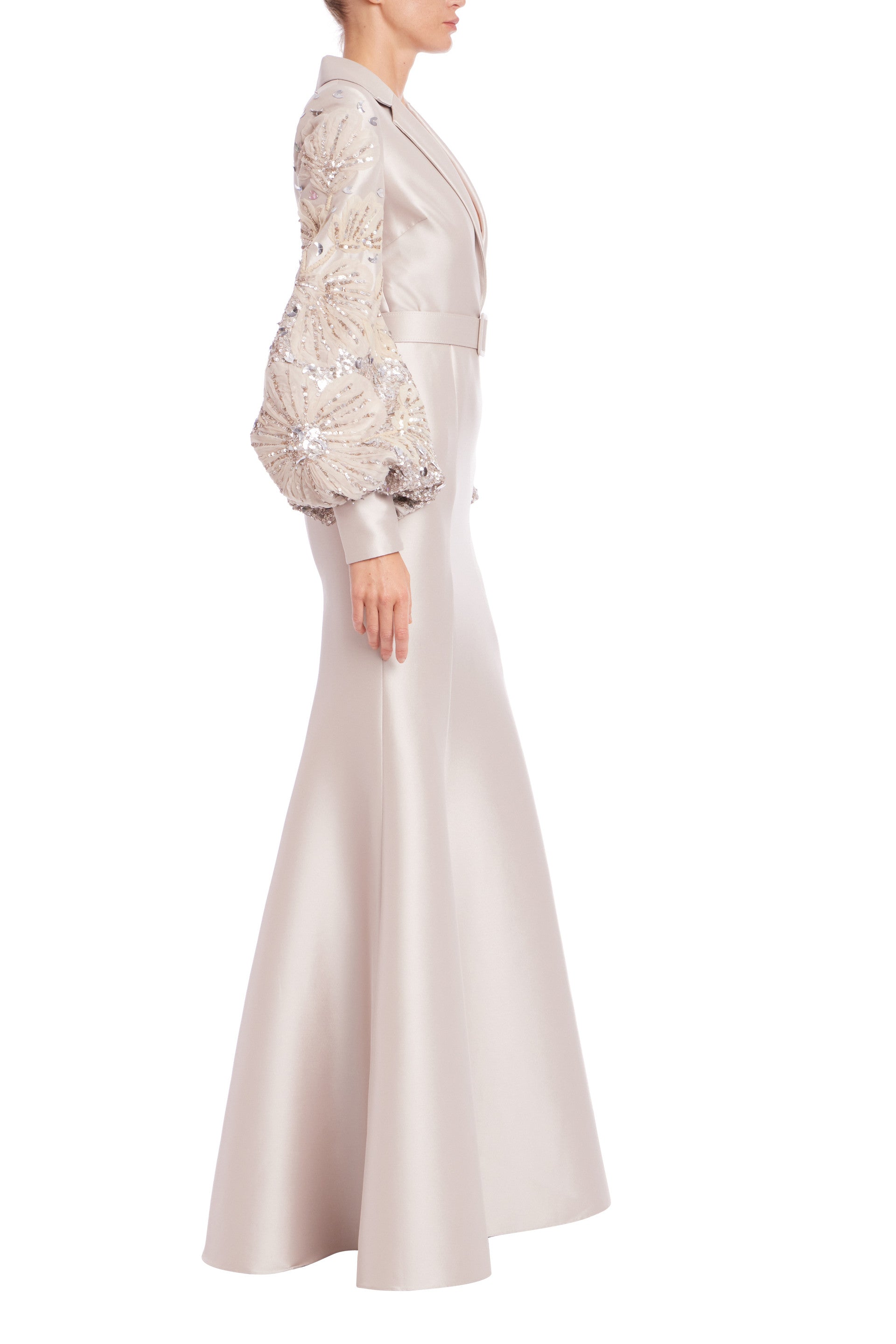Badgley Mischka Plunging Lapel Neckline Beaded Long Puff Sleeves Cinching Waist Belt Mermaid Hem Gown Dress