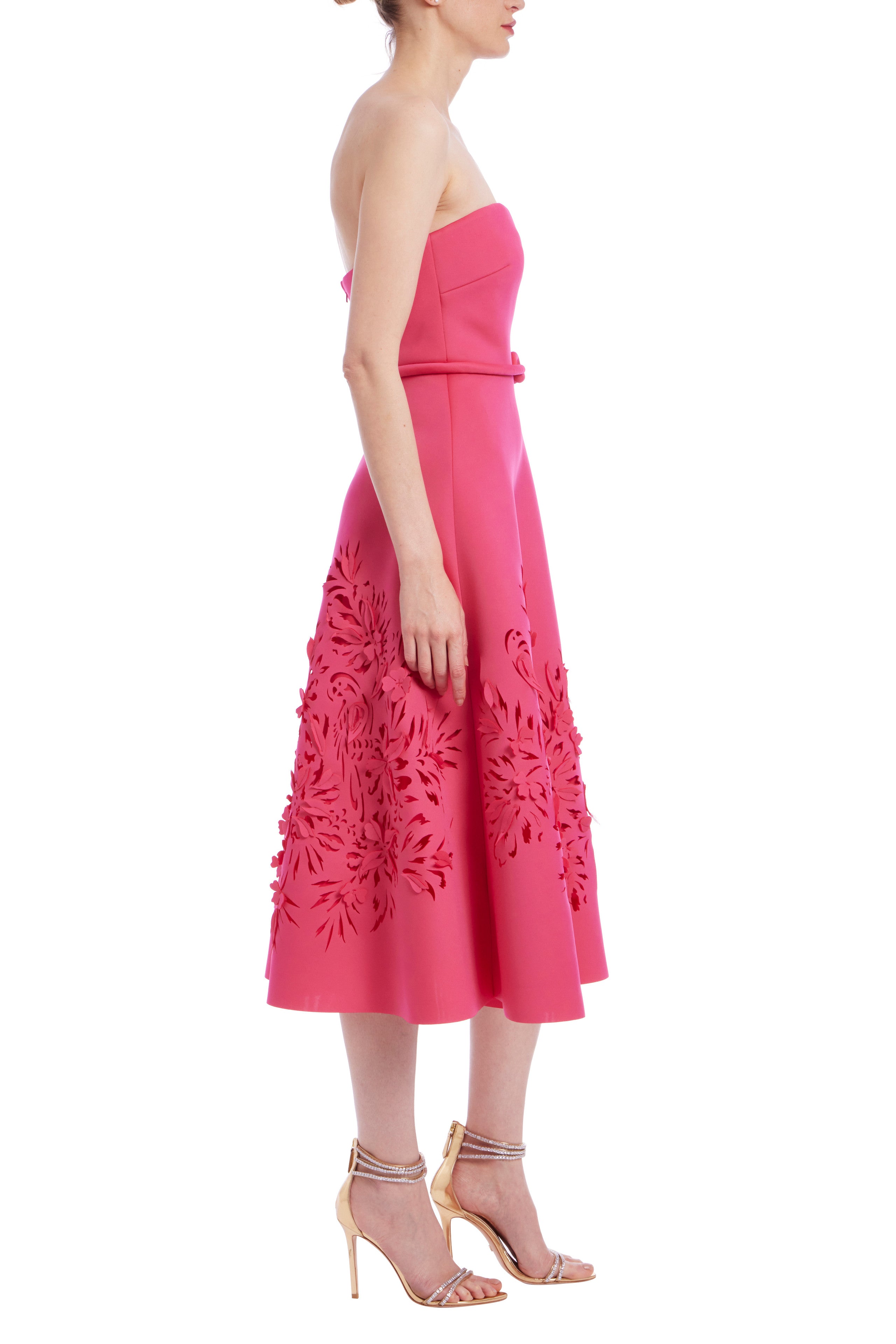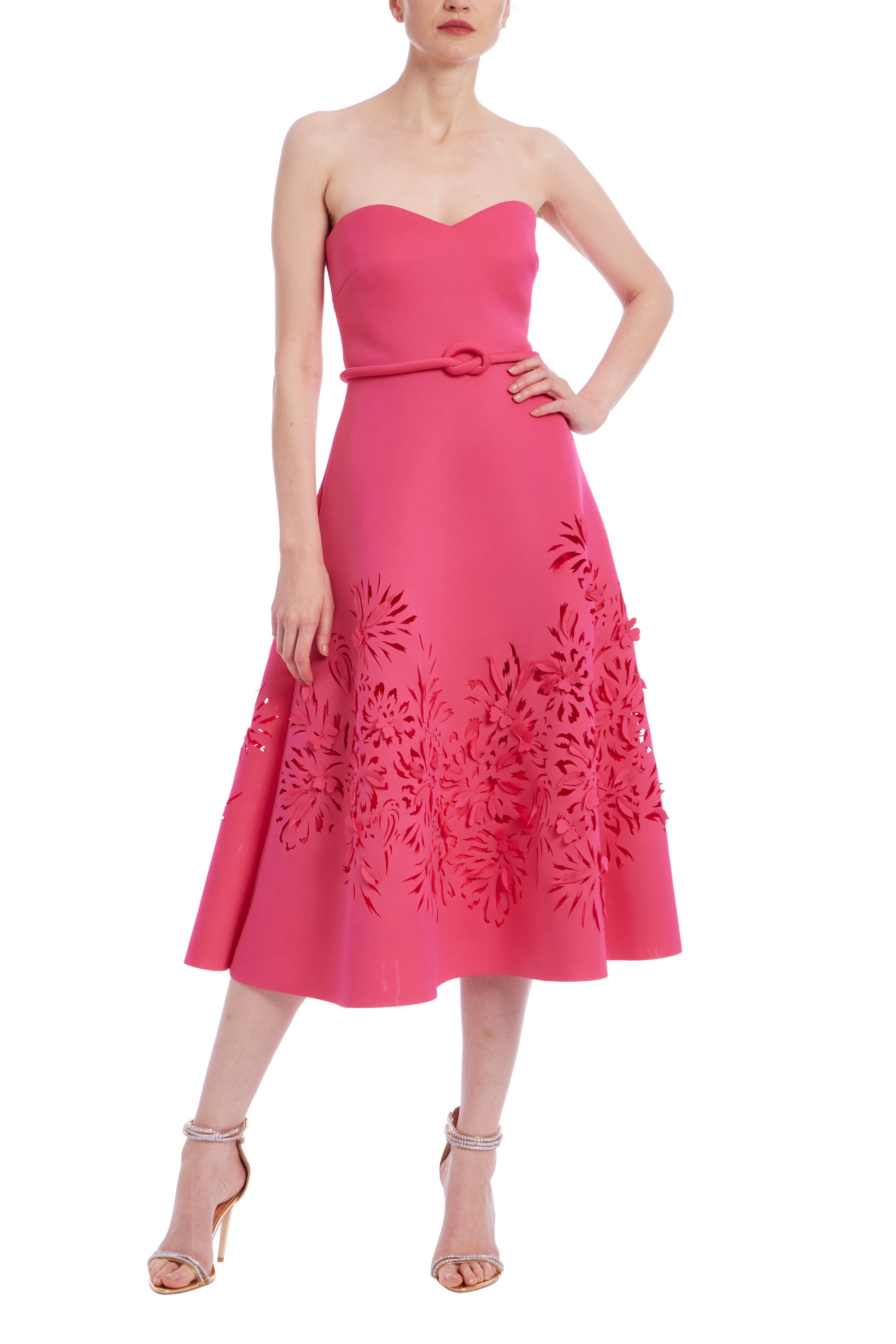 Badgley Mischka Strapless Laser-Cut Floral Knotted Belt Stretch Scuba Midi Bodice Zipper Back Dress