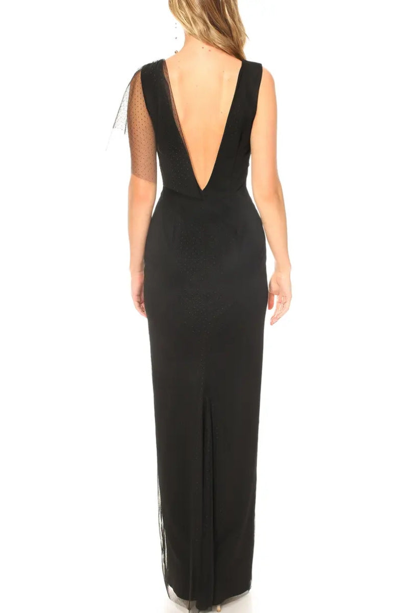 Crafted from luxe 100% polyester, this gown features a plunging neckline that exudes confidence and femininity, balanced by a refined center twist detail and artful ruching that sculpts the silhouette with elegant precision. The draped design flows effortlessly down the body, while the hidden back zip closure ensures a seamless, tailored finish from behind. The rich black hue offers timeless appeal, making this gown an ideal choice for a range of upscale occasions where sophistication and bold styling go hand-in-hand.