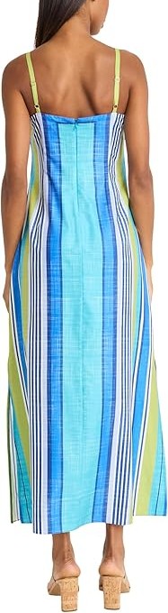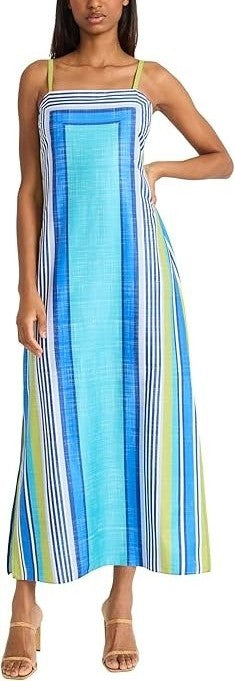 Finished with a concealed zipper back closure for a secure and polished fit, this dress balances effortless elegance with statement color. The blue multi stripe palette makes it a strong choice for warm-weather assortments, destination wear, and elevated daytime-to-evening occasions.