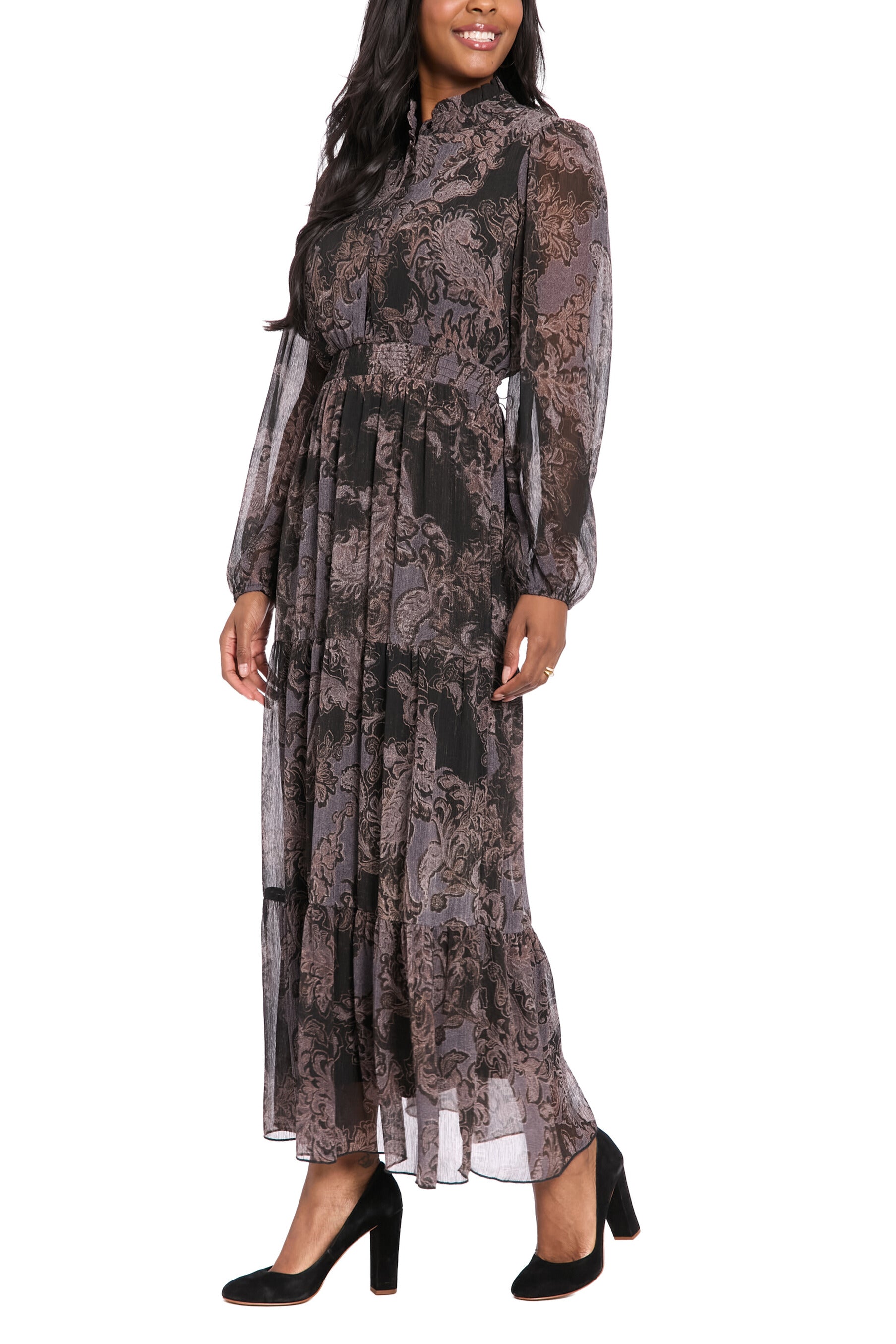 This London Times maxi dress combines timeless elegance with thoughtful design details. The collared neckline with delicate ruffles frames your face beautifully, while long bishop sleeves with elastic cuffs offer graceful movement and versatility. A fitted bodice with smocked waistband creates a flattering silhouette that transitions into a flowing tiered skirt, perfect for creating dimension and ease of movement. The zipper closure ensures a secure fit, and the fit-and-flare cut is designed to complement various body types. Ideal for special occasions, garden parties, or elevated everyday wear, this dress brings together classic sophistication with modern comfort.
