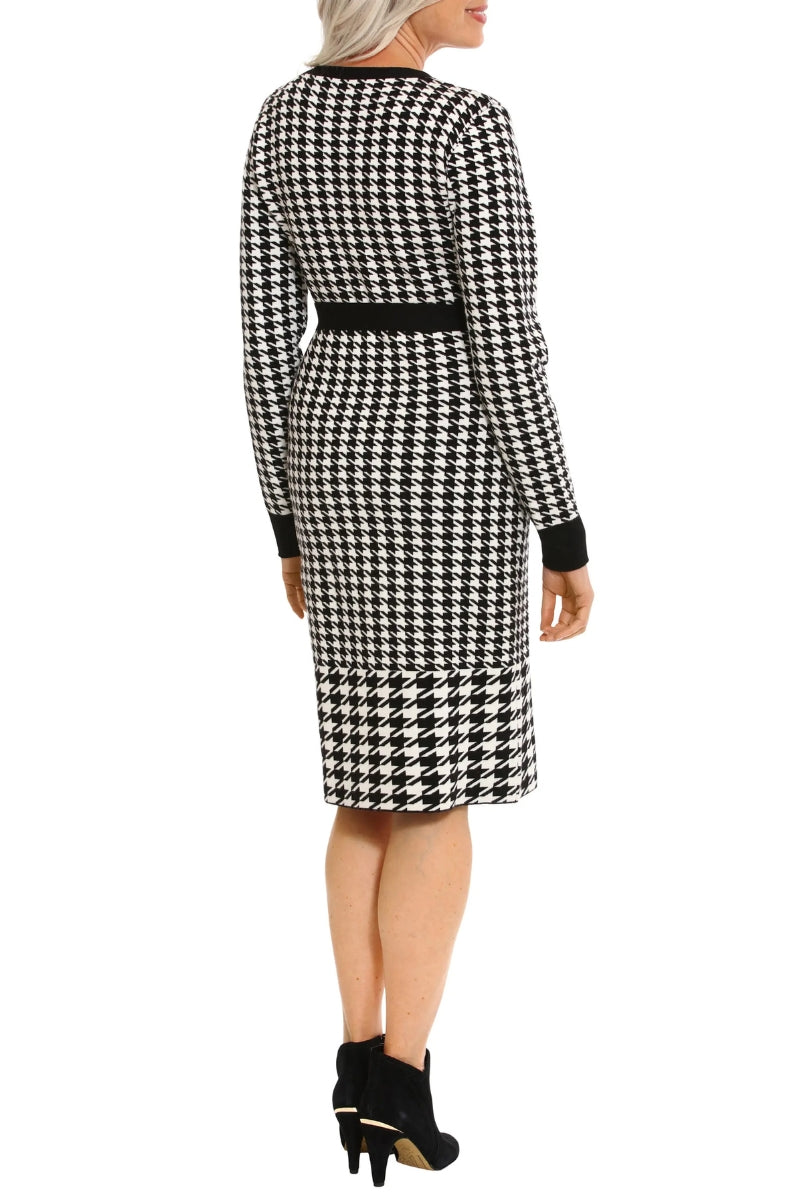 London Times Houndstooth Long Sleeves V-Neckline Cardigan Button-Down Waist Tie-Belt Straight-Fit Sheath Knit Midi Dress