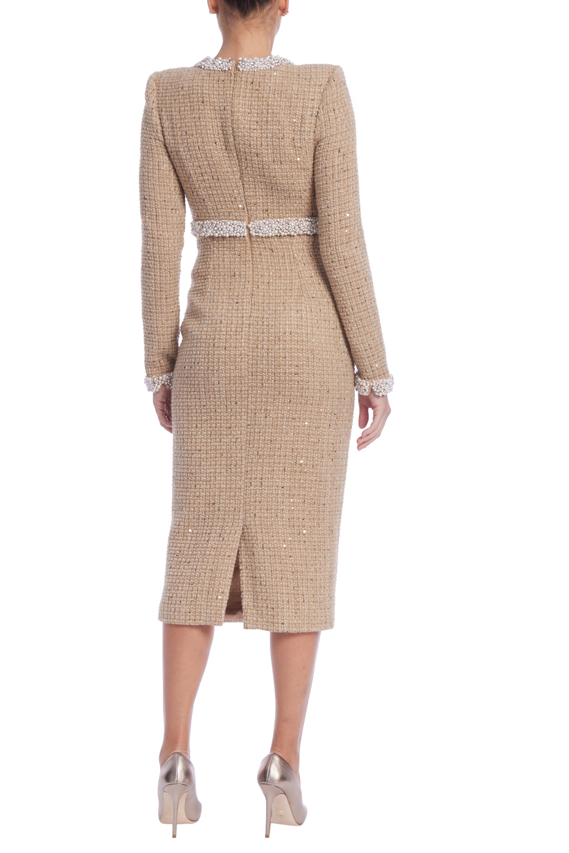 Badgley Mischka Pearl Trimmed Tweed Crew Neckline Long Sleeves Fitted Silhouette Below the Knee Midi Dress