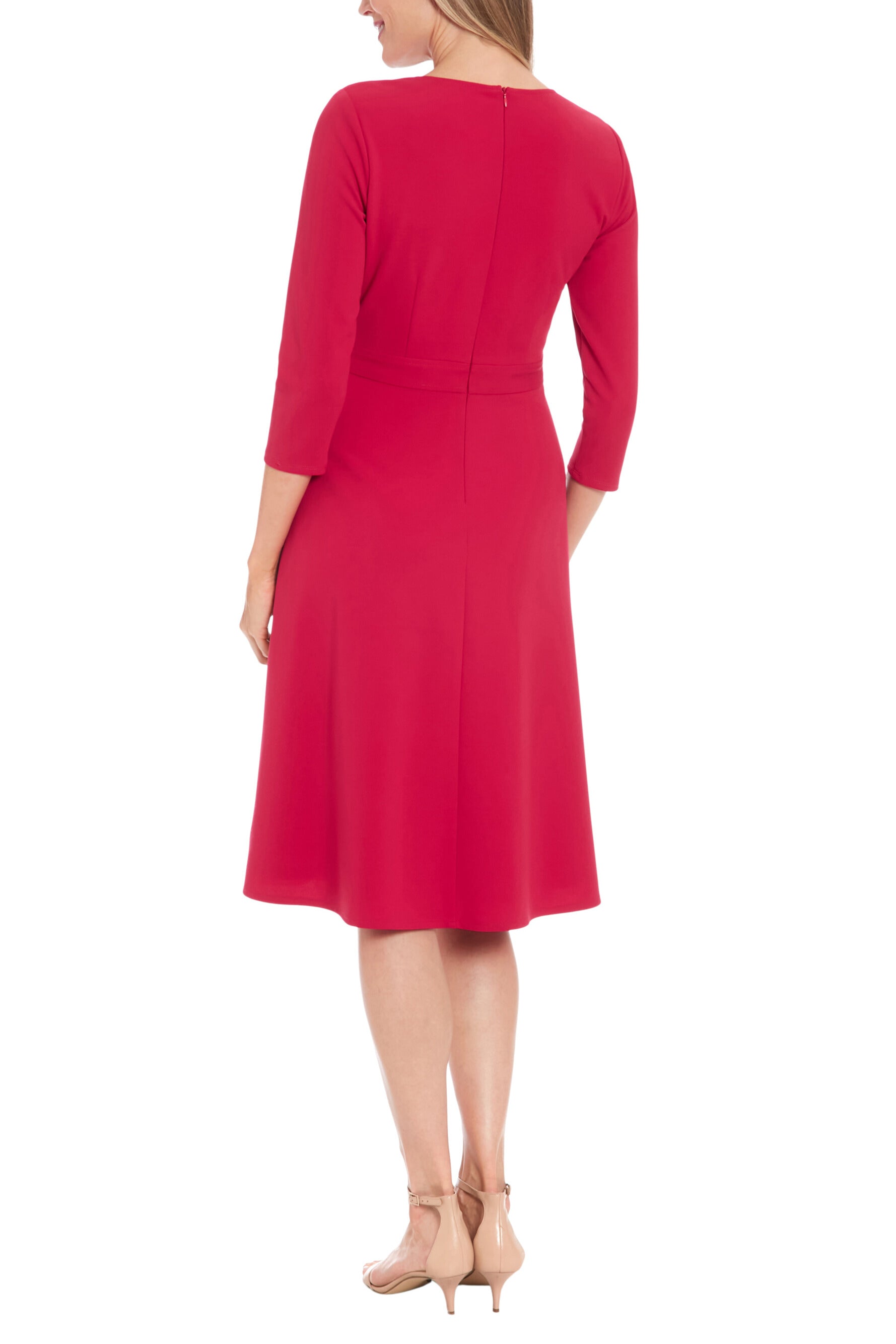 London Times V-Neckline Three-Quarter Sleeves Fit Bodice Pleated Fit-and-Flare A-Line Sangria Dress