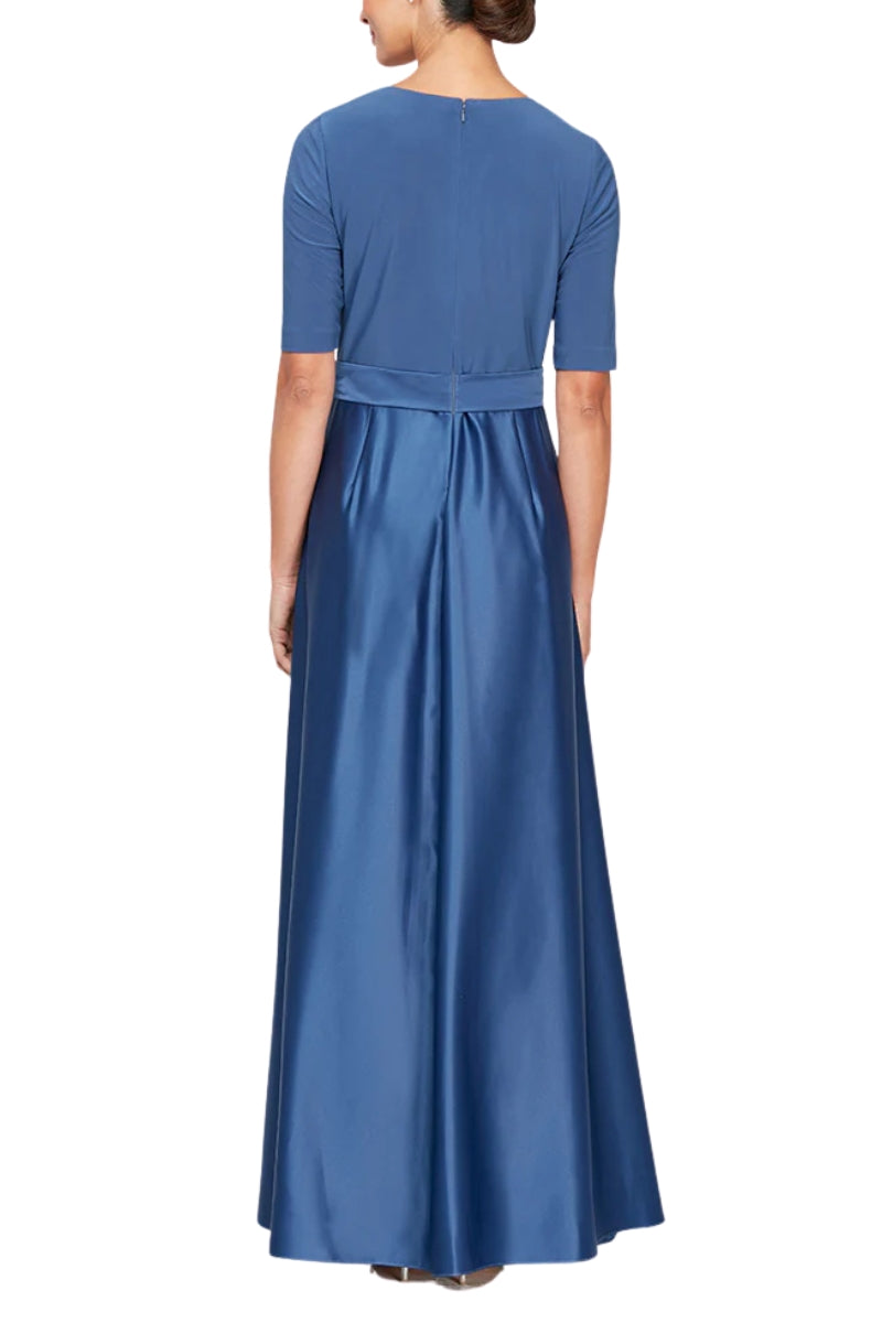 Make a sophisticated entrance in this Alex Evenings ballgown dress, designed to turn heads at any formal occasion. The elegant surplice V-neckline and elbow-length sleeves create a flattering silhouette, while the faux-wrap bodice adds dimension and style. A matching tie-belt cinches the waist for a polished look you can customize to your preference. The luxurious satin skirt flows into a graceful A-line ballgown shape, and convenient side seam pockets keep your essentials close. A discreet zipper closure ensures a smooth fit, making this dress both beautiful and practical for your special evening.