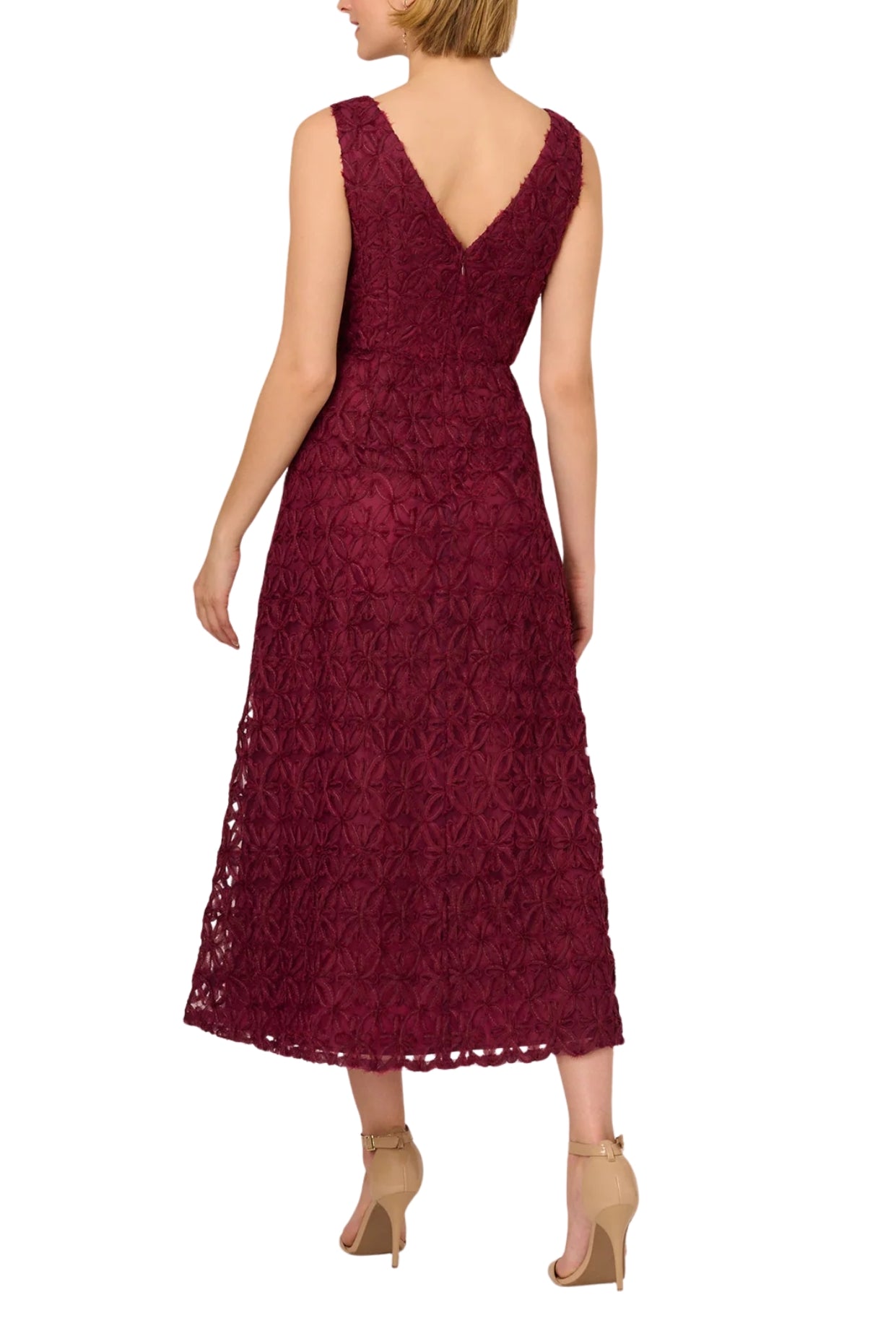 Adrianna Papell Sleeveless Soutache Embroidered Crepe Midi Dress in Light Wine