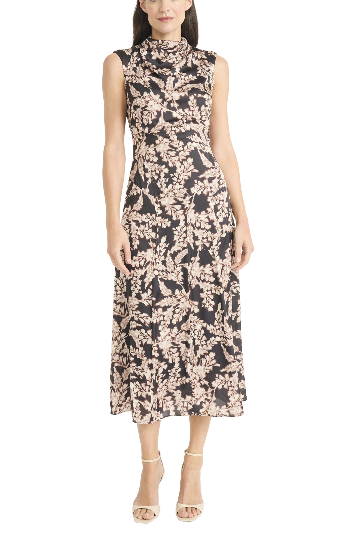 This Maggy London sleeveless midi dress features a refined cowl neckline and an elegant allover floral print in black and khaki tones. Designed with a flattering fitted bodice that flows into a softly draped midi-length skirt, the silhouette offers a polished balance of structure and movement.