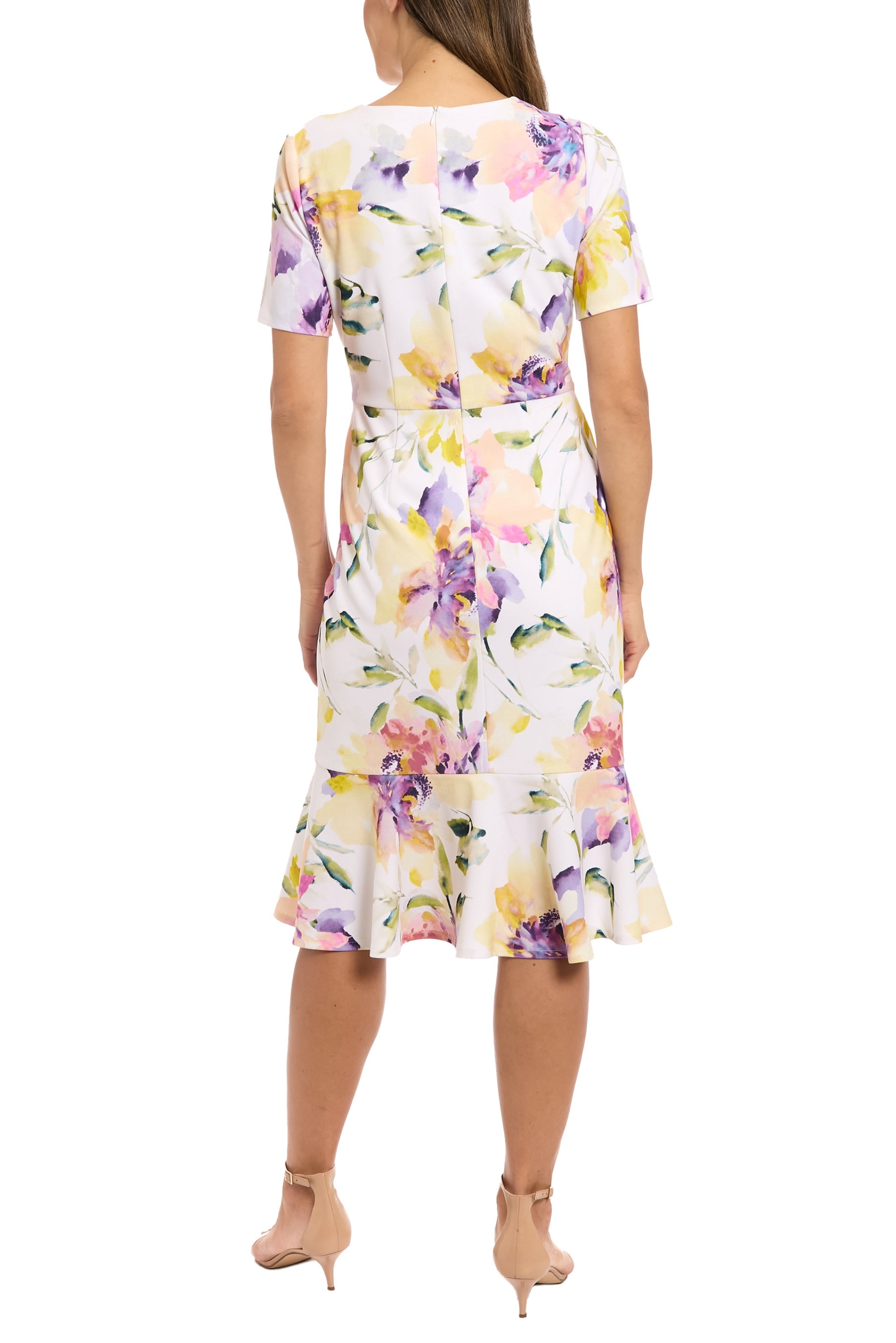 London Times Floral Twist V-Neckline Short Sleeves Back Zipper Flounce Hem Midi Dress