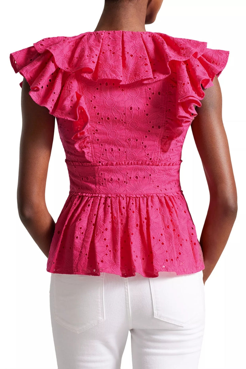Ted Baker Mazieh Allover Eyelet Embroidery V-Neckline Short Flutter Sleeves Banded Waist Peplum Hem Top