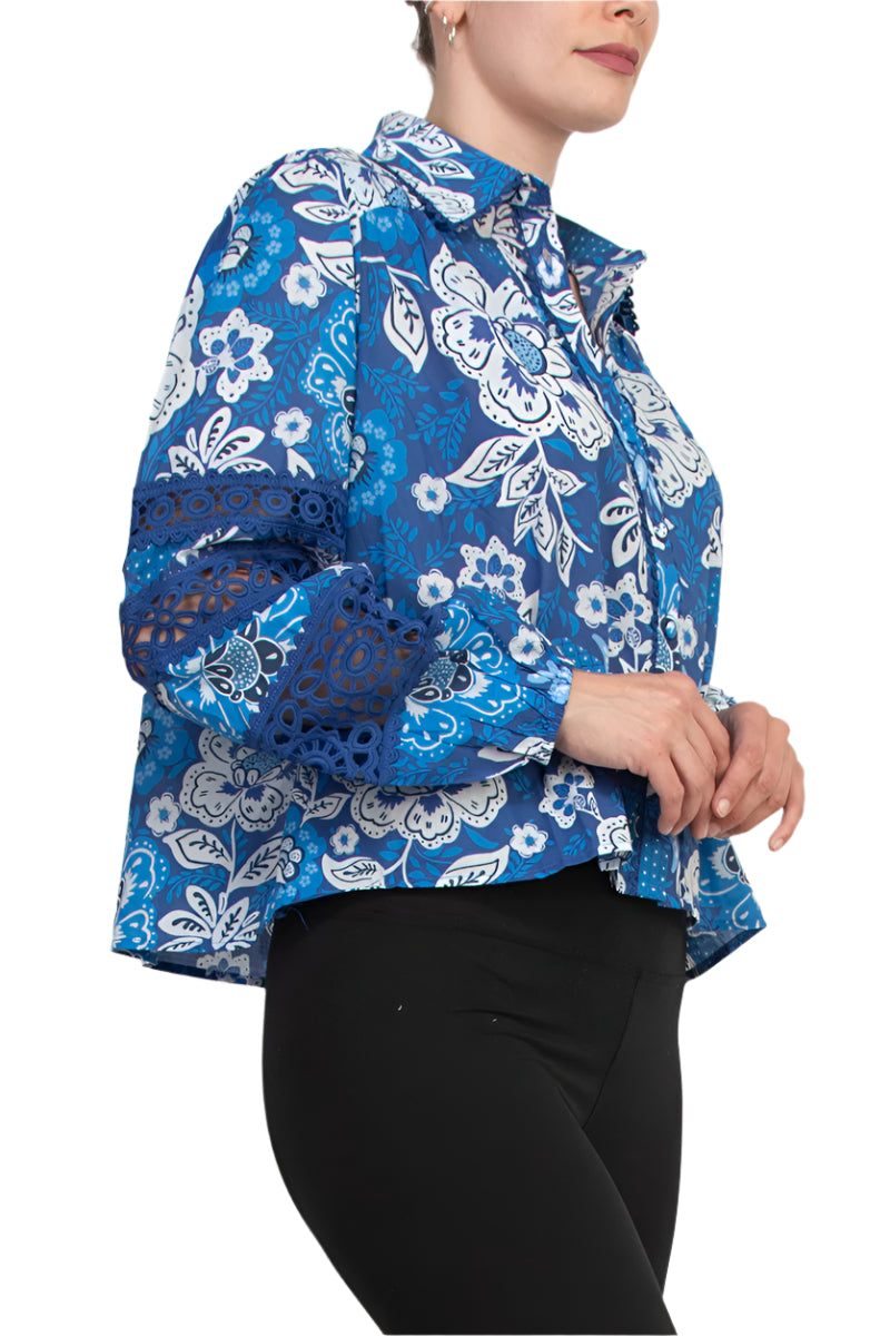 Made from breathable 100% cotton, this blouse dress combines all-day comfort with refined style. The vibrant blue floral print injects a fresh burst of colour into your look, while the lace trim detailing at the collar and sleeves adds a touch of feminine charm. The collared neckline and button-down silhouette strike a balance between structured and relaxed, making it perfect for both professional and off-duty settings.