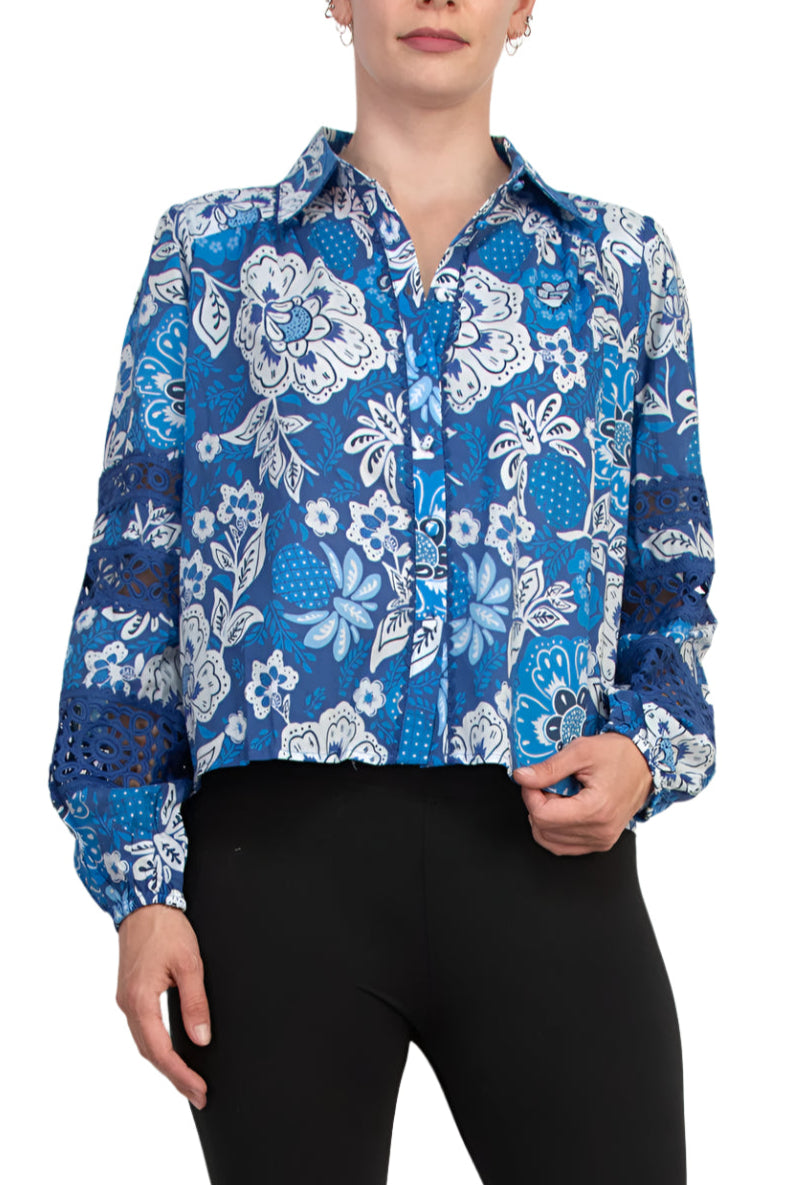 Elie Tahari Vibrant Blue Floral Collared Neckline Lace Trim Long Sleeves Top Blouse Dress