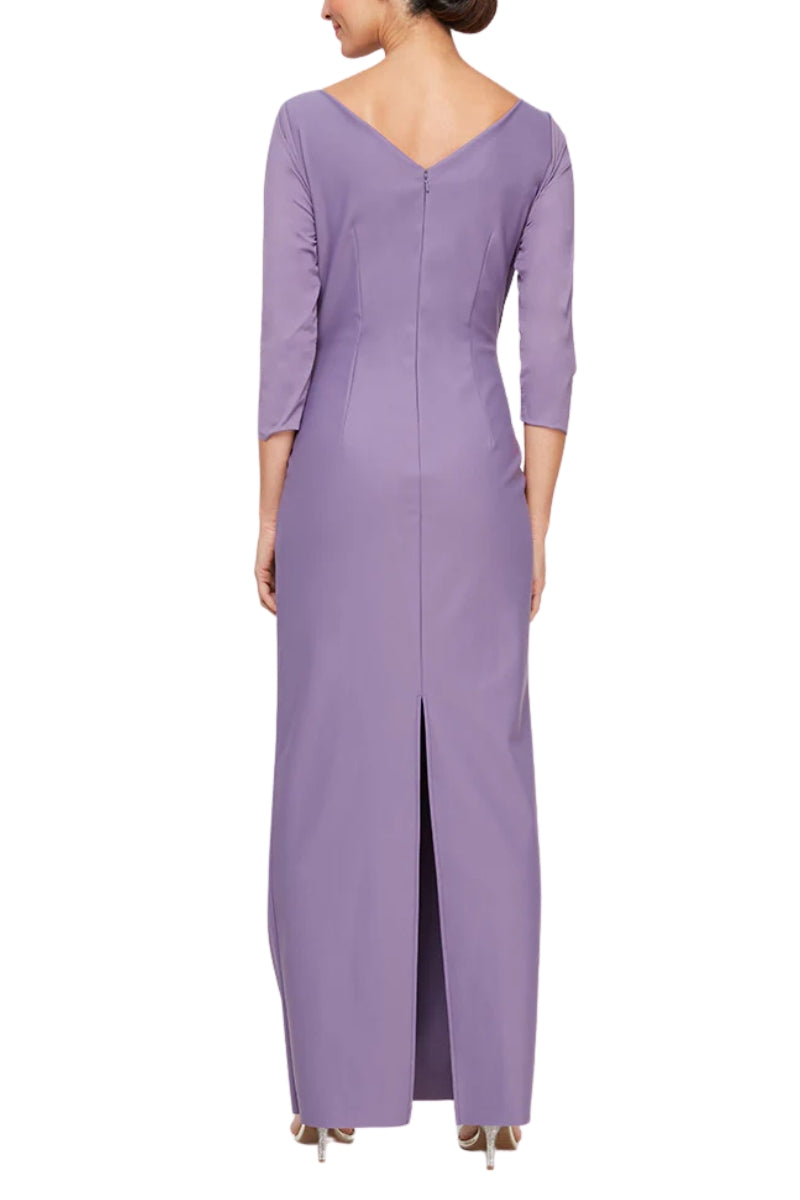 Alex Evenings Faux Surplice V-Neckline Quarter Sleeves Draped Cascade Ruffle Accent Waist Brooch Contour Sheath Maxi Dress