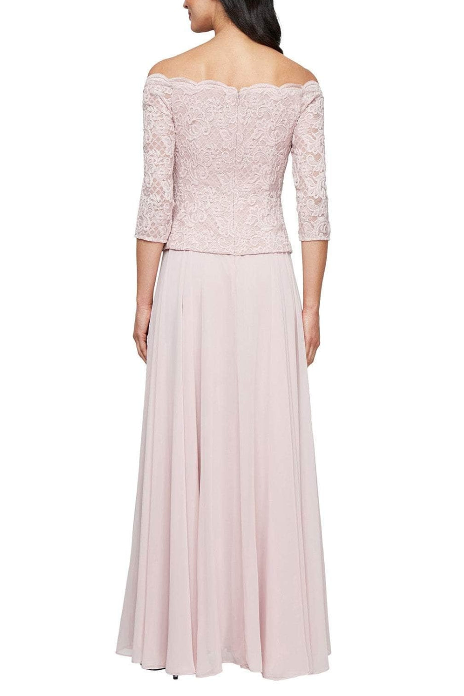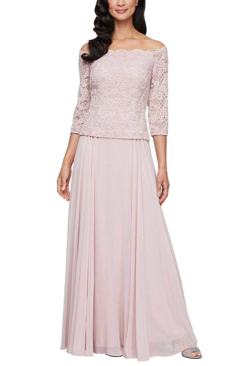 Alex Evenings Scallop Off-Shoulder Neckline Quarter Sleeves Flowy Bodice A-Line Skirt Gown Dress