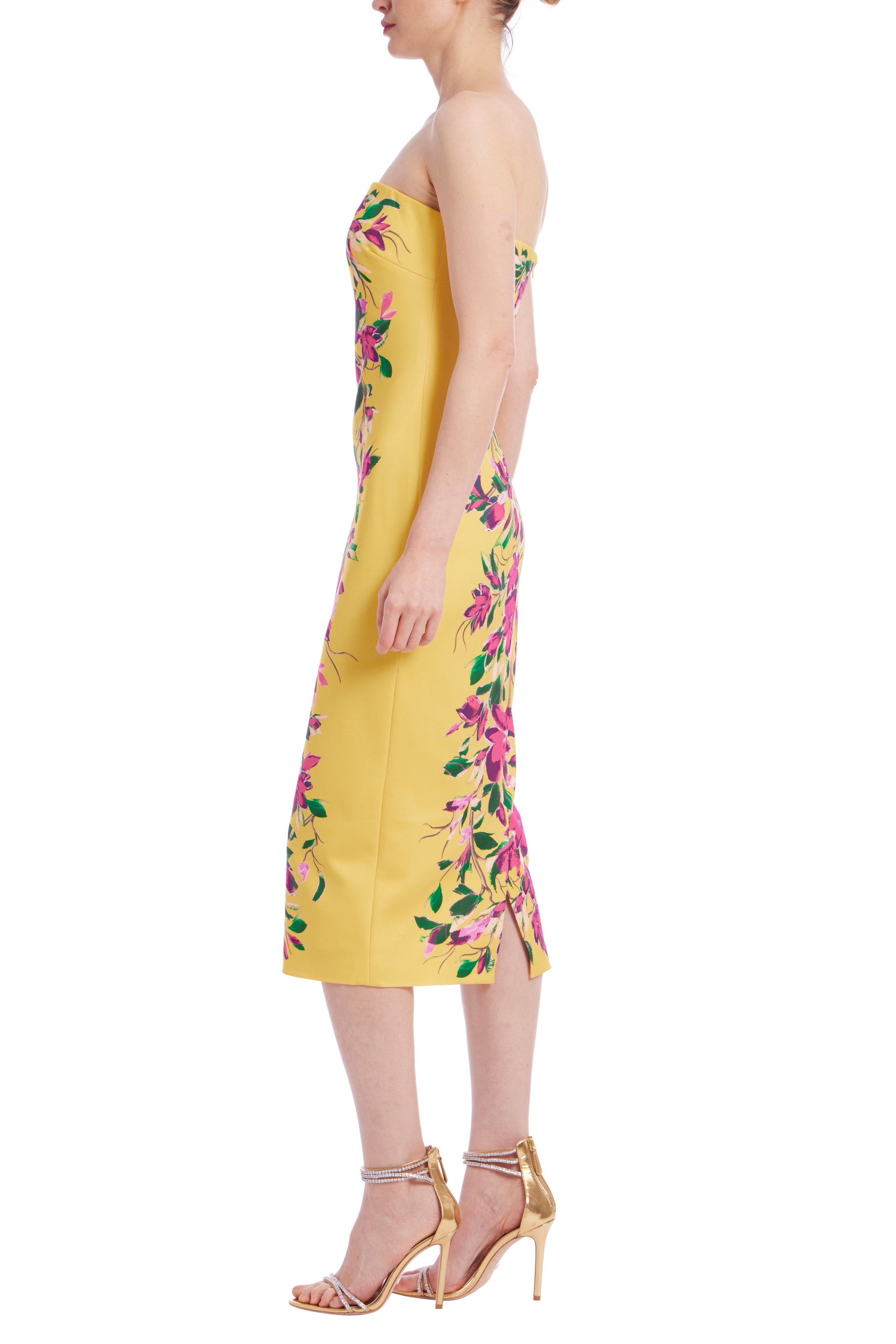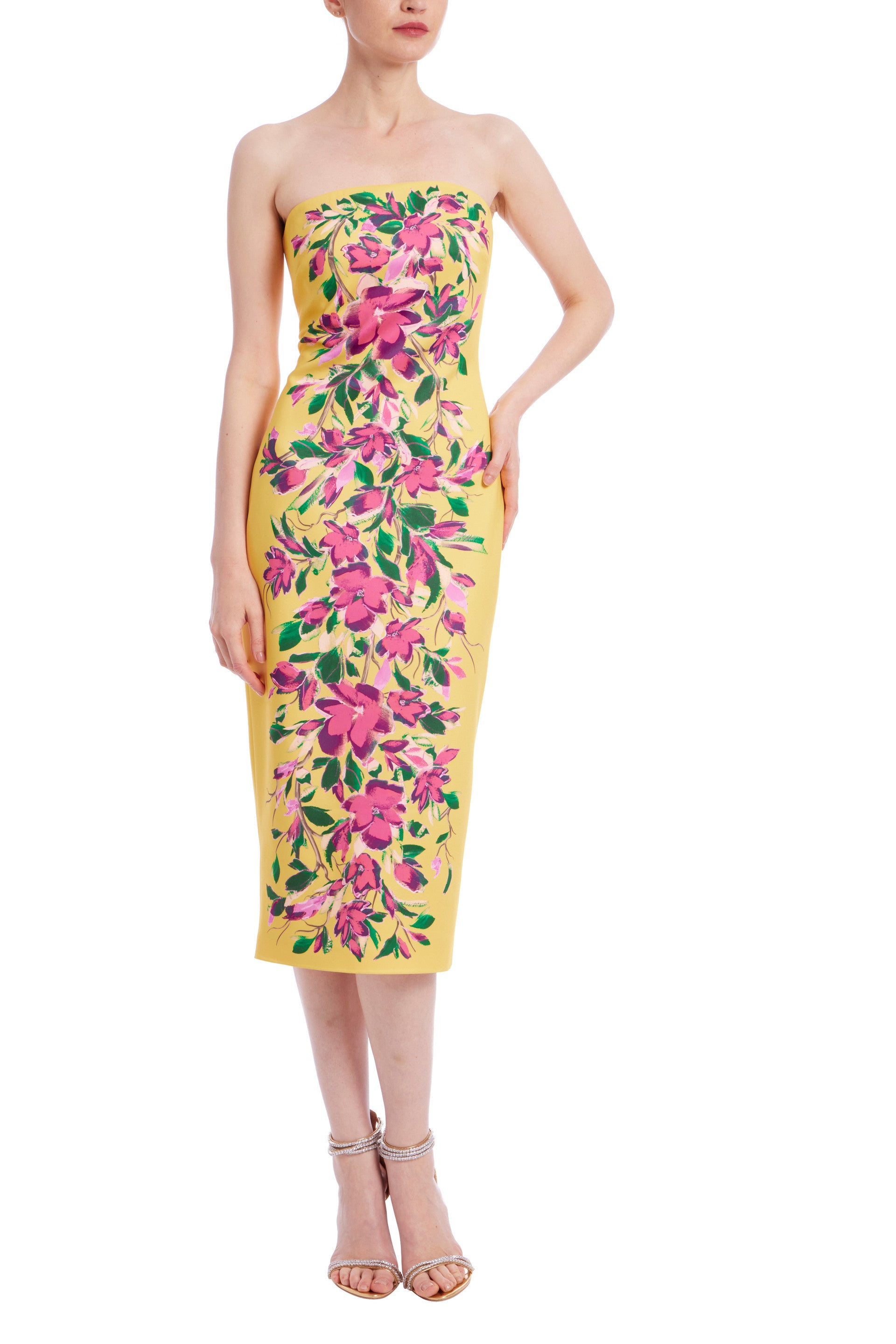 Badgley Mischka Strapless Back Zipper Closure Below-The-Knee Floral Sheath Midi Dress