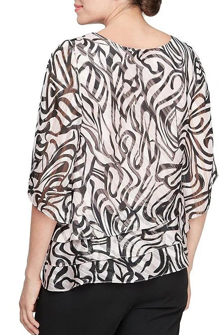 Elevate your wardrobe with this stunning Alex Evenings tunic blouse, featuring a sophisticated black and pink print that brings timeless elegance to any occasion. The classic boat neckline flatters the shoulders while elbow-length flutter sleeves add a graceful, feminine touch. A beautifully tiered bodice design creates dimension and visual interest, making this piece perfect for dinners, events, or elevated everyday wear. Versatile and refined, this blouse pairs effortlessly with your favorite pants or skirts for a polished look you'll love wearing again and again.