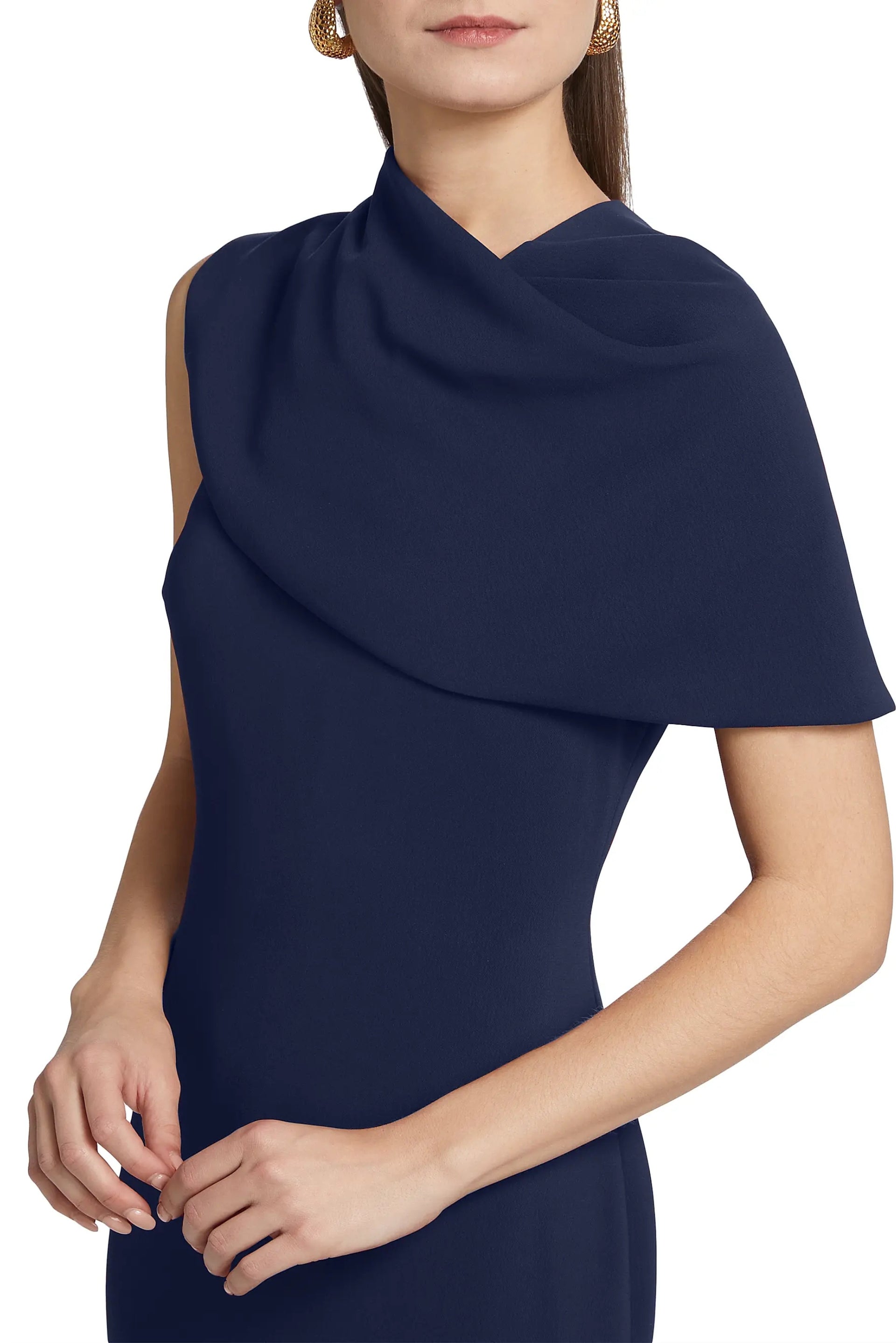 Pourquoi choisir la robe midi à encolure asymétrique et manches cape Badgley Mischka ?