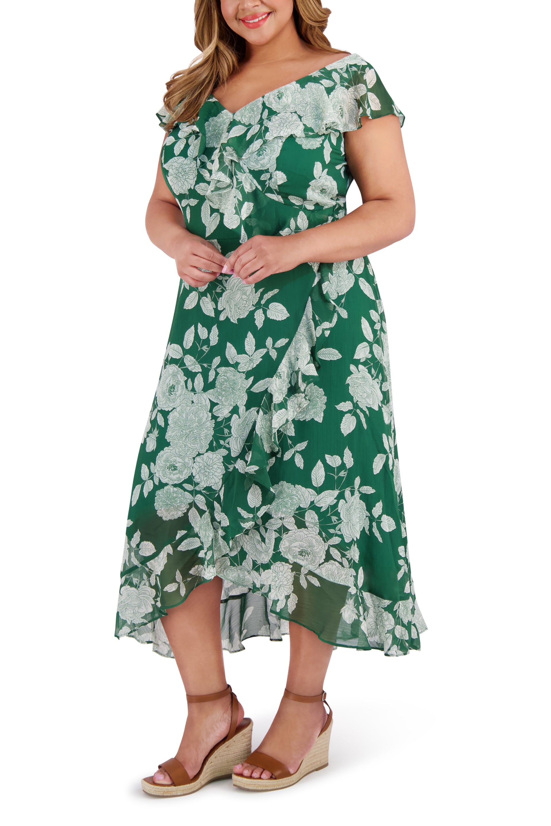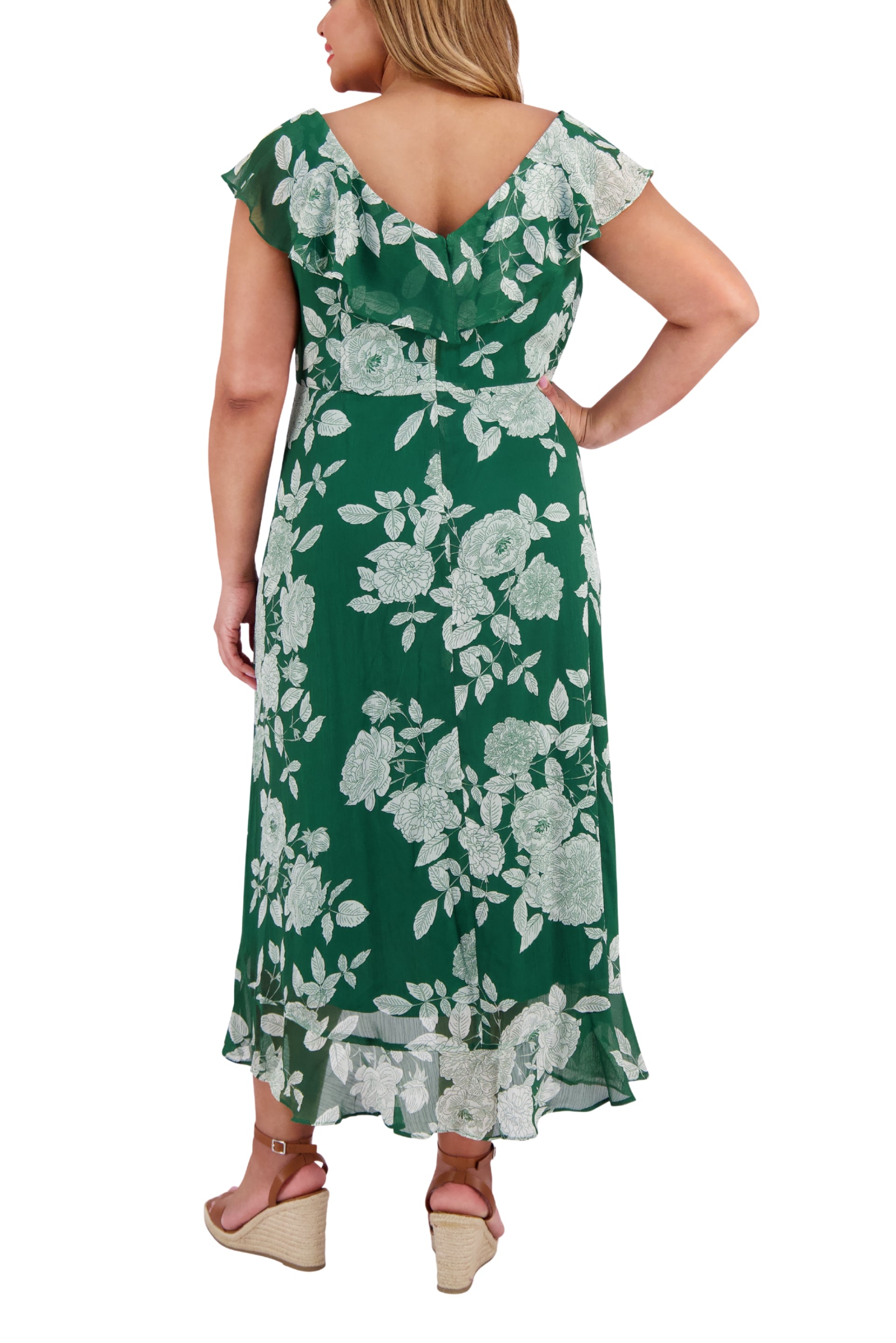 Embrace elegance with the London Times V-Neck Ruffled Floral Print Zipper Back Chiffon Maxi Dress. Its soft chiffon fabric and flattering V-neckline offer comfort and style, while delicate ruffles and a vibrant floral print add feminine charm. The convenient zipper back ensures a perfect fit, making it ideal for special occasions or effortless everyday grace.