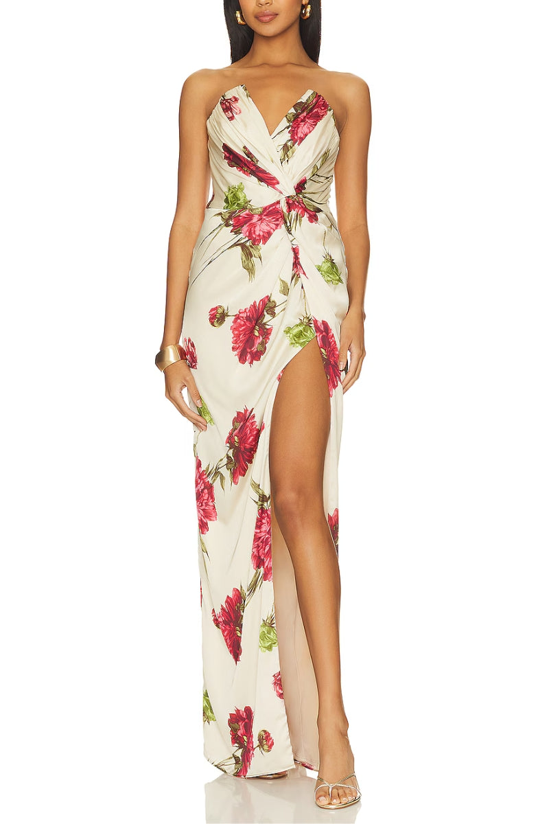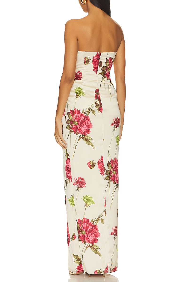 Robe longue ajustée Katie May à imprimé floral, sans bretelles, corsage torsadé, fermeture éclair au dos, couture latérale fendue